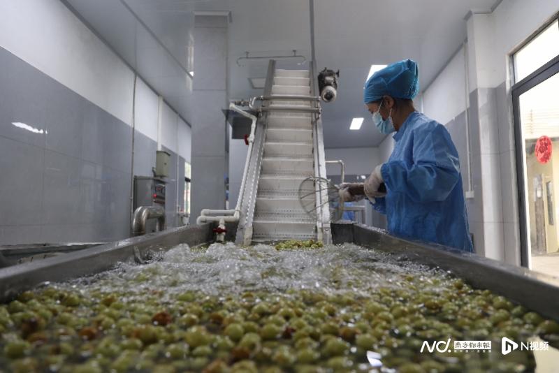 日耀農(nóng)夫油柑種植專業(yè)合作社的工廠內(nèi),工人正將新鮮采摘的果實送上傳送帶清洗分揀。攝影 南都記者 蔡肇宇