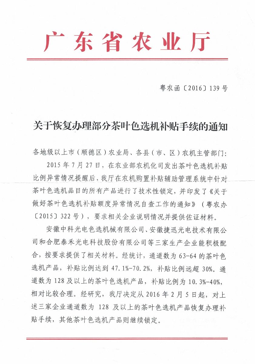 關(guān)于恢復(fù)辦理部分茶葉色選機補貼手續(xù)的通知