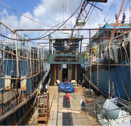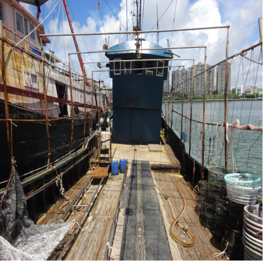 5.編號(hào)“扣5”船舶,船上沒(méi)有船名號(hào)標(biāo)識(shí),船體材質(zhì)鋼質(zhì),總長(zhǎng)23.55米,型寬4.55米,主機(jī)1部,主機(jī)型號(hào)X61707C-5W,主機(jī)功率300KW。