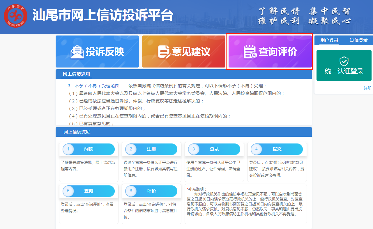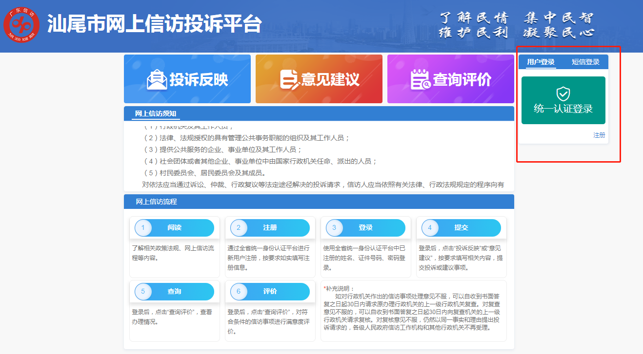 步驟二 進(jìn)入“汕尾市網(wǎng)上信訪投訴平臺”后,請點(diǎn)擊右側(cè)“統(tǒng)一認(rèn)證登錄”。