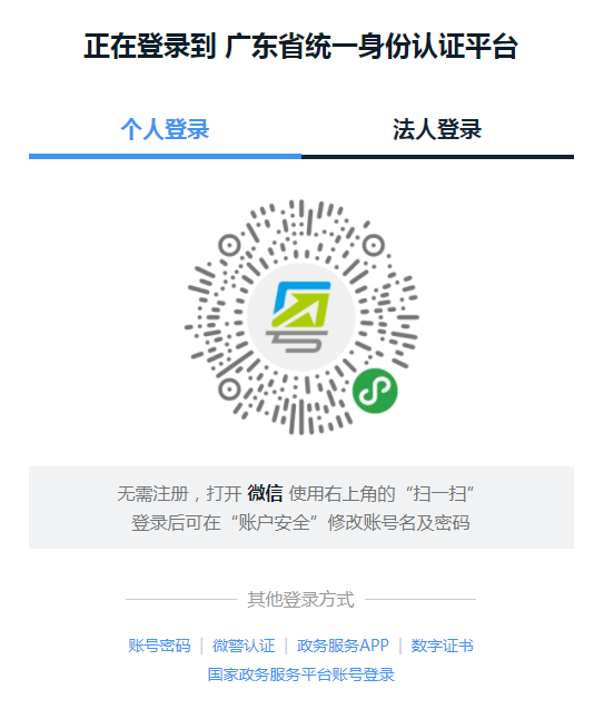 步驟三 進(jìn)入“廣東省統(tǒng)一身份認(rèn)證平臺”頁面,點(diǎn)擊“個(gè)人登錄”或者“法人登錄”,使用微信掃描“粵省事”二維碼進(jìn)行身份認(rèn)證登錄。