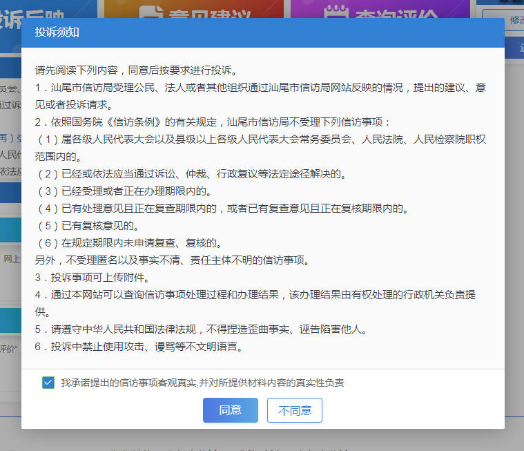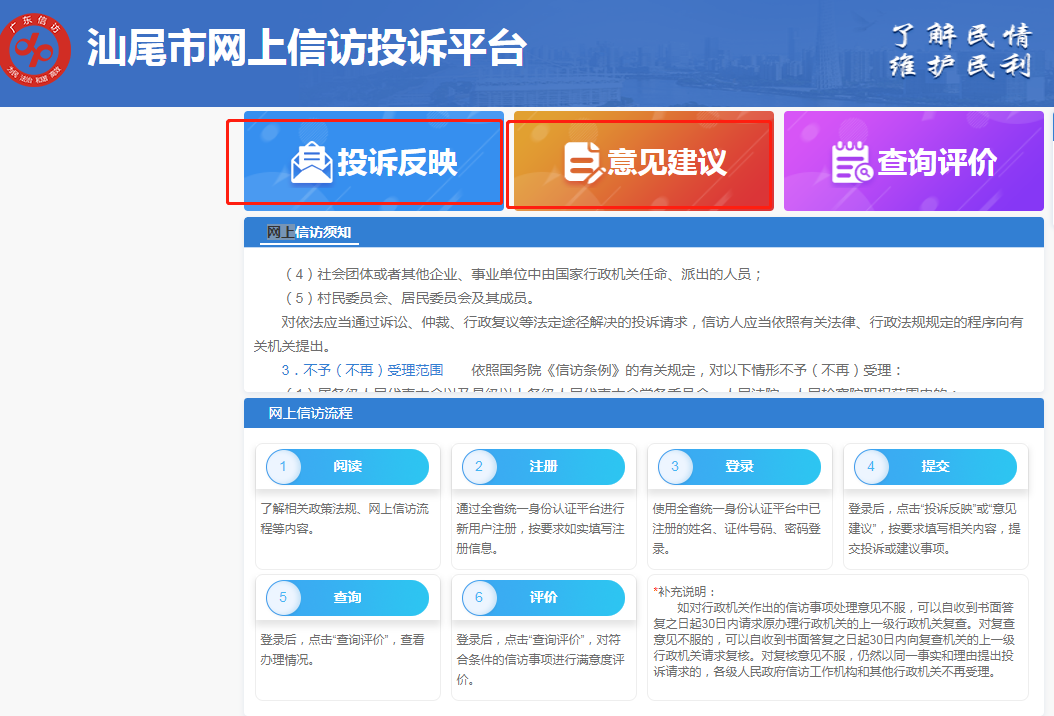 步驟四登錄成功后,進(jìn)入“汕尾市網(wǎng)上信訪投訴平臺”,進(jìn)行網(wǎng)信信訪投訴前,請認(rèn)真閱讀投訴平臺首頁“網(wǎng)上信訪須知”。您可根據(jù)你的實(shí)際情況,選擇你的訴求類型“投訴反映”或“意見建議”。