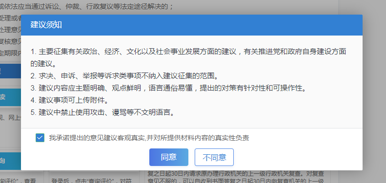 步驟五 ①如您選擇“意見建議”,將進(jìn)入“意見建議—建議須知”頁面,請您認(rèn)真閱讀建議須知內(nèi)容,選擇“我承諾我提出的意見建議客觀真實(shí),并對所提供材料內(nèi)容的真實(shí)性負(fù)責(zé)”,點(diǎn)擊“確認(rèn)”。