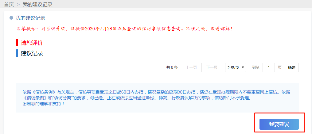 當(dāng)您“確認(rèn)”后,將進(jìn)入“我的建議記錄”頁面,點(diǎn)擊下方“我要建議”填寫您的意見建議。
