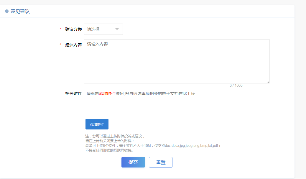 填寫意見建議時(shí),第一步選擇“問題分類”,請您根據(jù)實(shí)際情況認(rèn)真選擇,這有利于我們準(zhǔn)確的甄別您的訴求,轉(zhuǎn)交給有關(guān)部門及時(shí)處理;第二步在“您提出的建議涉及的領(lǐng)域和針對的問題”欄填寫您需要反映的內(nèi)容,內(nèi)容填寫不超過800字,如您反映的具體內(nèi)容比較多,或者有圖片等依據(jù)材料,您可選擇“添加附件”,將有關(guān)依據(jù)添加到附件欄,此處單個(gè)附件不得超過10M,最多只能添加5個(gè)附件;第三步 您填寫完所有信息,確認(rèn)無誤后點(diǎn)擊“提交”即可完成您的操作。