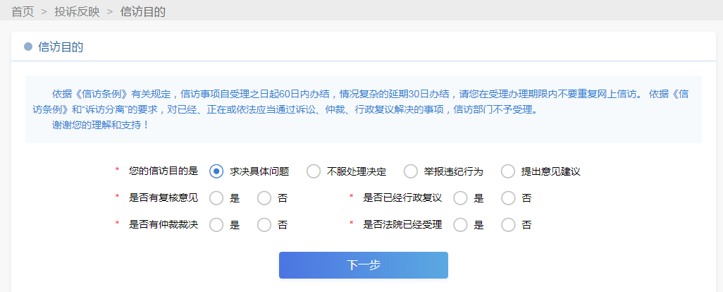 第一步進(jìn)入“信訪目的”頁面,請認(rèn)真閱讀提醒內(nèi)容后,選擇您的“信訪目的”,并按您的訴求實(shí)際情況選擇是否有復(fù)查復(fù)核意見、是否有仲裁裁決、是否法院已受理、是否已行政復(fù)議等選項(xiàng),這有利于工作人員對于您基本訴求的甄別,確保您的訴求能準(zhǔn)確及時(shí)轉(zhuǎn)交到有關(guān)部門。完成相關(guān)選項(xiàng)請點(diǎn)擊“下一步”,進(jìn)入“投訴請求”頁面。