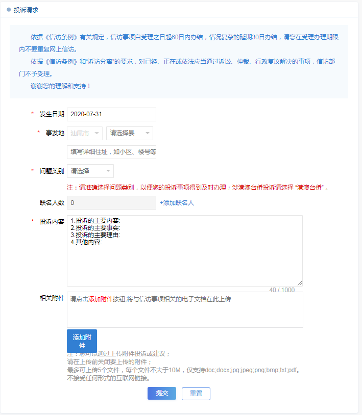 第二步在“投訴請求”頁面,請按要求選擇“發(fā)生日期”“事發(fā)地”“問題類別”等選項(xiàng),并在“投訴內(nèi)容欄”填寫您需要反映訴求的主要內(nèi)容、主要事實(shí)、主要理由及需要反映的其他內(nèi)容,此欄內(nèi)容填寫不超過800字,如您反映的具體內(nèi)容比較多,或者有圖片等依據(jù)材料,您可選擇“添加附件”,將有關(guān)依據(jù)添加到附件欄,此處單個(gè)附件不得超過10M,最多只能添加5個(gè)附件。如還有其他人員與您共同反映問題,你可點(diǎn)擊“添加聯(lián)名人”添加相關(guān)人員個(gè)人信息。