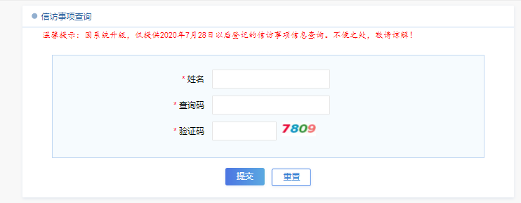 進(jìn)入“信訪事項(xiàng)查閱”頁面后,在相應(yīng)的輸入框中輸入姓名、查詢碼及驗(yàn)證碼,點(diǎn)擊“提交”即可查詢。