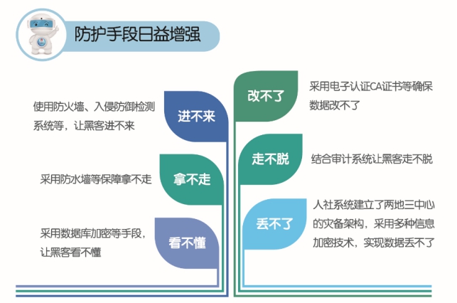 2 丟不了:人社系統(tǒng)建立了災(zāi)備架構(gòu),采用多種信息加密技術(shù),實(shí)現(xiàn)數(shù)據(jù)丟不了。