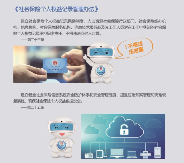 3.《社會(huì)保險(xiǎn)個(gè)人權(quán)益記錄管理辦法》。第二十三條:建立社會(huì)保險(xiǎn)個(gè)人權(quán)益記錄保密制度。人力資源社會(huì)保障行政部門、社會(huì)保險(xiǎn)經(jīng)辦機(jī)構(gòu)、信息機(jī)構(gòu)、社會(huì)保險(xiǎn)服務(wù)機(jī)構(gòu)、信息技術(shù)服務(wù)商及其工作人員對(duì)在工作中獲知的社會(huì)保險(xiǎn)個(gè)人權(quán)益記錄承擔(dān)保密責(zé)任,不得違法向他人泄露。第二十五條:建立健全社會(huì)保險(xiǎn)信息系統(tǒng)安全防護(hù)體系和安全管理制度,加強(qiáng)應(yīng)急預(yù)案管理和災(zāi)難恢復(fù)演練,確保社會(huì)保險(xiǎn)個(gè)人權(quán)益數(shù)據(jù)安全。