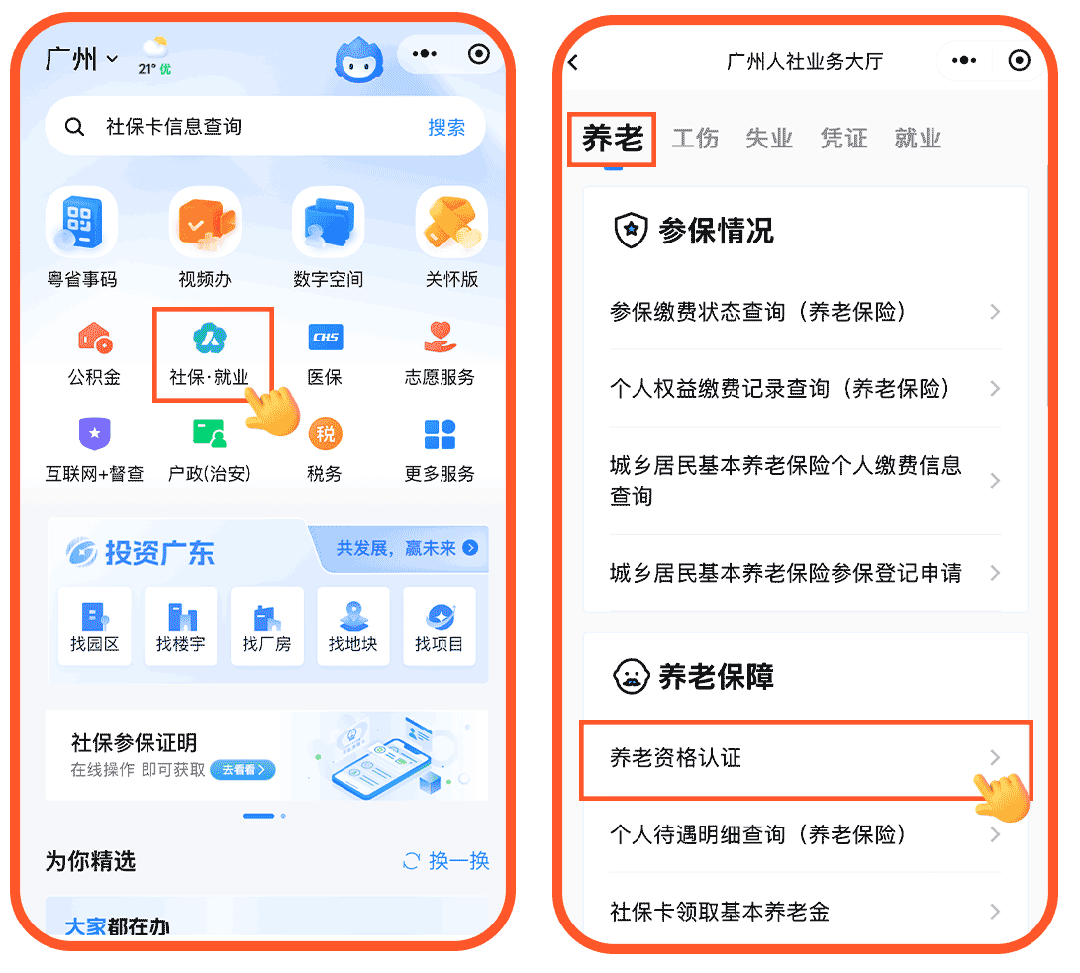 微信進入“粵省事”微信小程序,首頁左上角切換至參保所在地市,點擊“社?!痹凇梆B(yǎng)老”板塊點擊“養(yǎng)老資格認證”,選擇“城鄉(xiāng)居民基本養(yǎng)老保險待遇領(lǐng)取資格認證”根據(jù)提示操作即可進行資格認證。