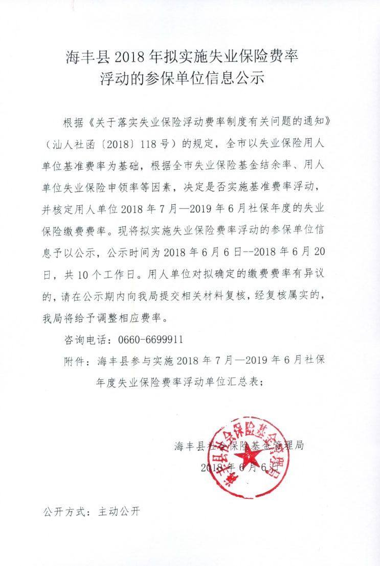 海豐縣2018年擬實(shí)施失業(yè)保險(xiǎn)費(fèi)率浮動的參保單位信息公示