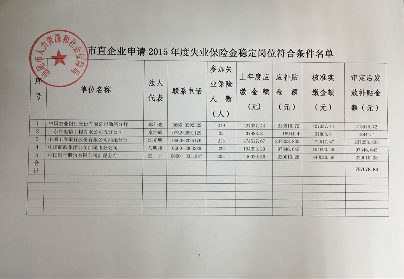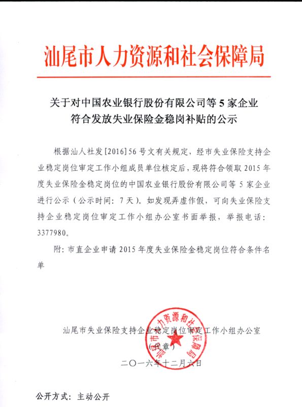 關(guān)于對(duì)中國(guó)農(nóng)業(yè)銀行股份有限公司等5家企業(yè)符合發(fā)放失業(yè)保險(xiǎn)金穩(wěn)崗補(bǔ)貼的公示
