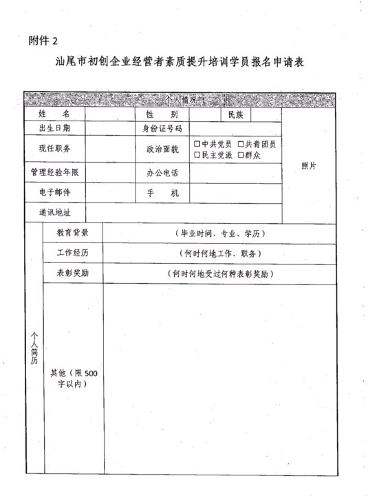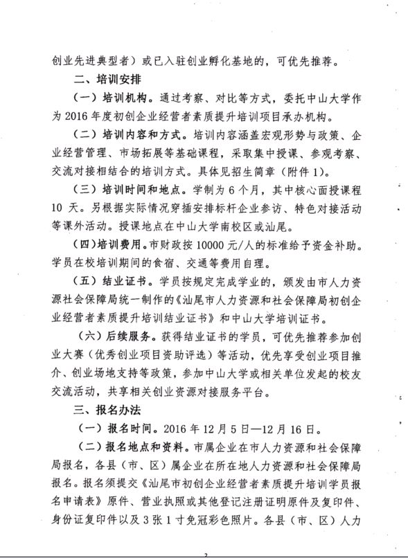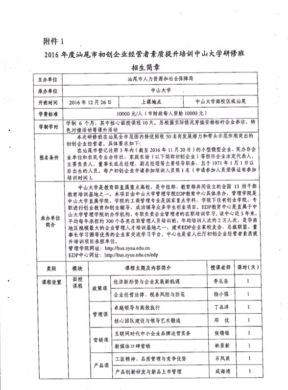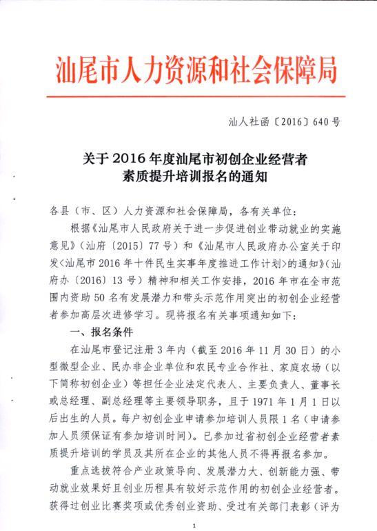 關(guān)于2016年度汕尾市初創(chuàng)企業(yè)經(jīng)營者素質(zhì)提升培訓(xùn)報名的通知