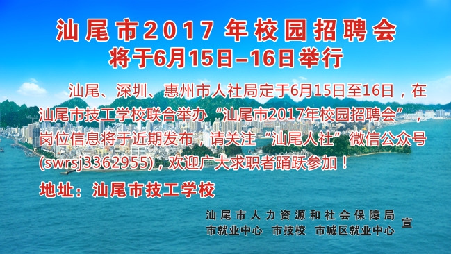 汕尾市2017年校園招聘會將于6月15-16日舉行