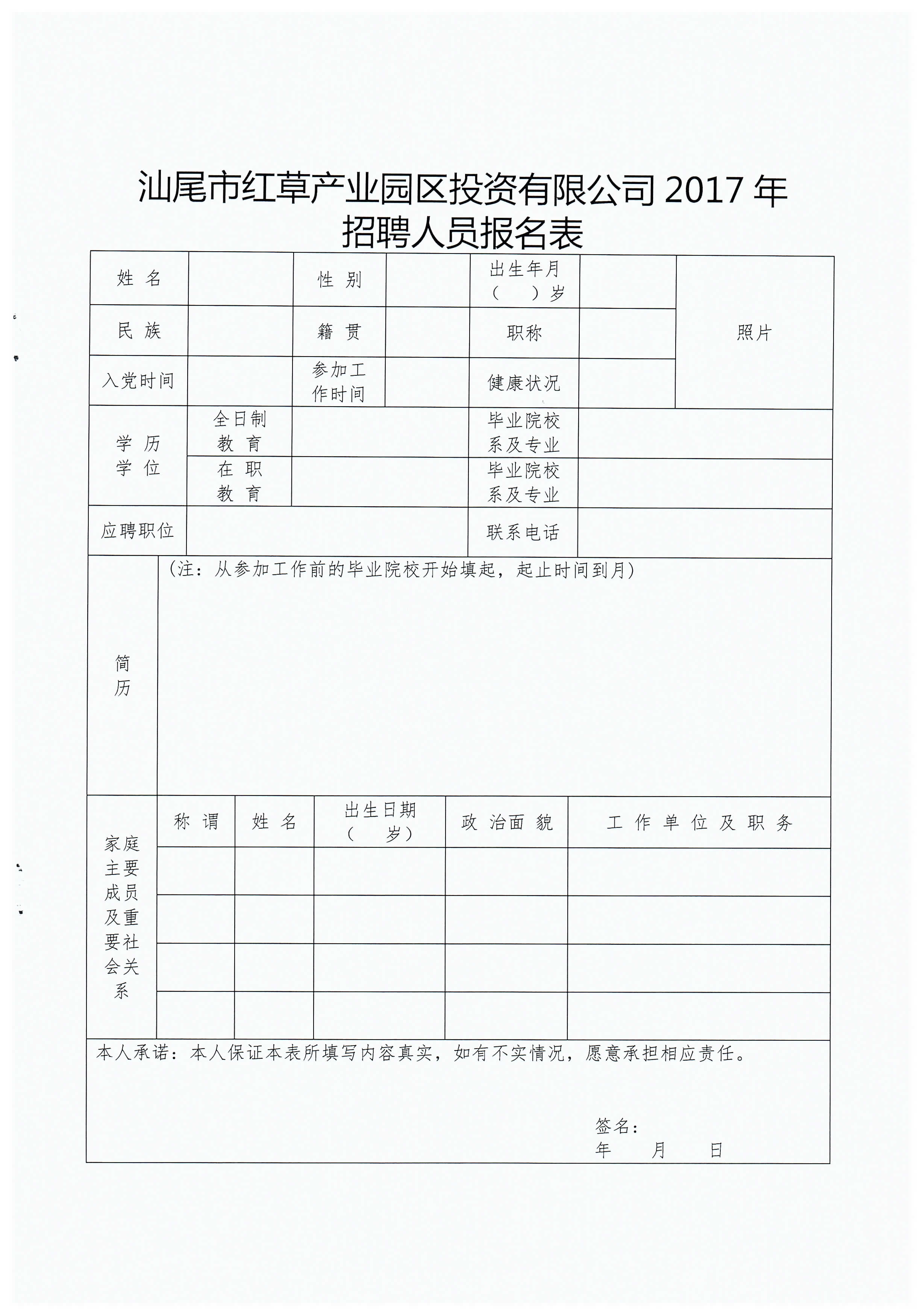附件:汕尾市紅草產(chǎn)業(yè)園區(qū)投資有限公司2017年招聘人員報(bào)名表.docx