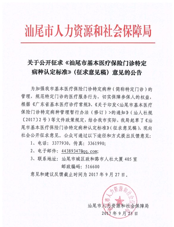 關(guān)于公開征求《汕尾市基本醫(yī)療保險門診特定病種認(rèn)定標(biāo)準(zhǔn)》(征求意見稿)