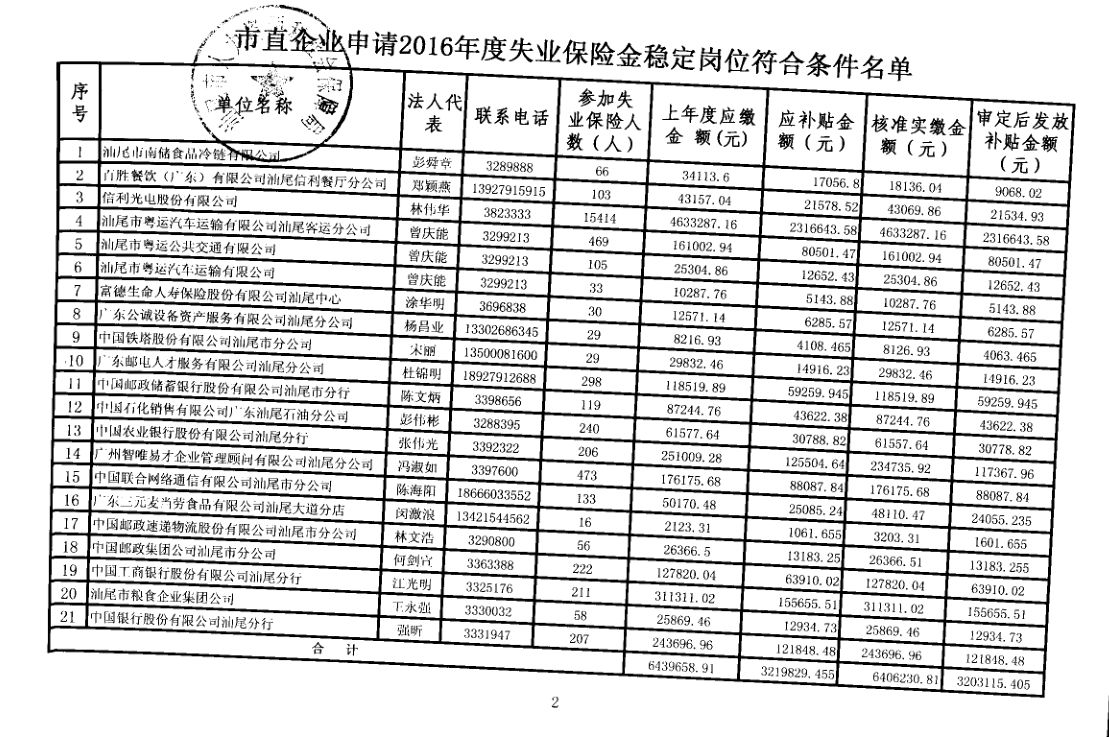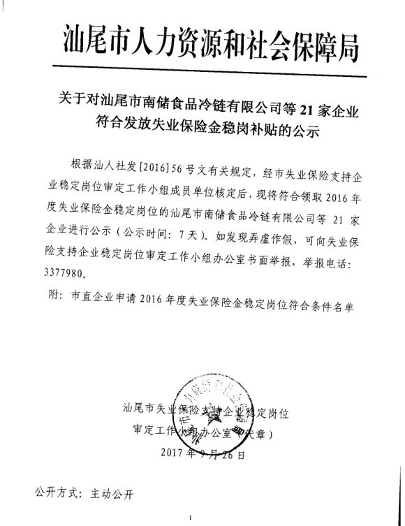 關(guān)于對汕尾市南儲(chǔ)食品冷鏈有限公司等21家企業(yè)符合發(fā)放失業(yè)保險(xiǎn)金穩(wěn)崗