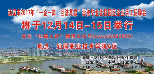 招聘會名稱:汕尾市2017年“一企一崗·互濟共贏”高校畢業(yè)生暨園區(qū)企業(yè)用工招聘會