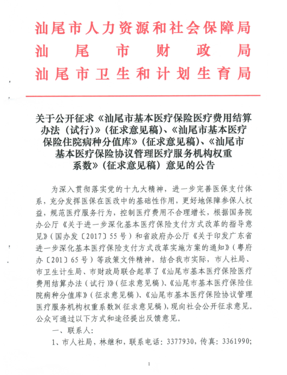 關于公開征求《汕尾市基本醫(yī)療保險醫(yī)療費用結算辦法(試行)》(征求意見稿)意見的公告
