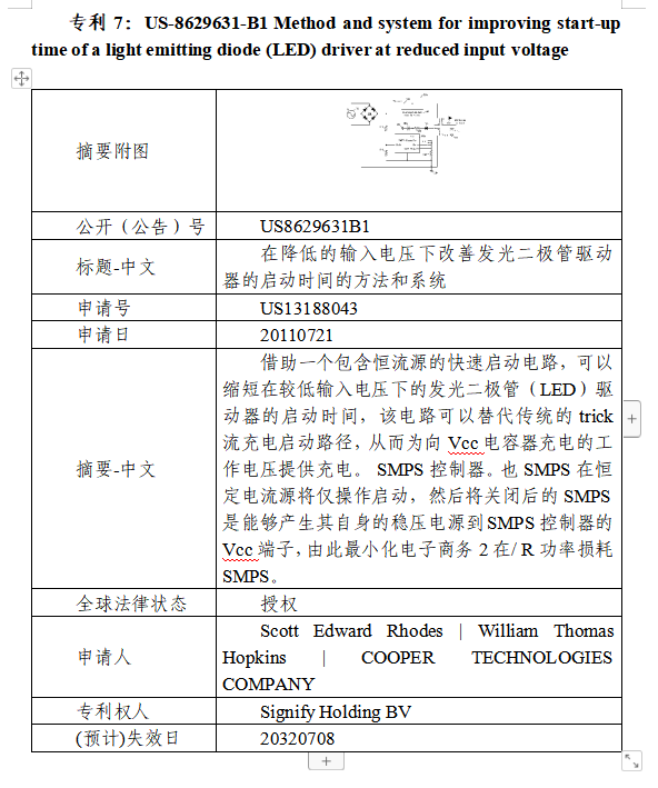 涉案專利共20件,涉及LED驅(qū)動(dòng)電路、光學(xué)元件、系統(tǒng)架構(gòu)等,專利信息詳見(jiàn)下表。值得注意的是,在20件涉案專利中,有7件專利在Signify和Current的訴訟中均有涉及,11件專利由Current提起不侵權(quán)宣告而并未被Signify作為專利侵權(quán)訴訟基礎(chǔ),2件專利Signify作為專利侵權(quán)訴訟基礎(chǔ)但Current未提起不侵權(quán)宣告。