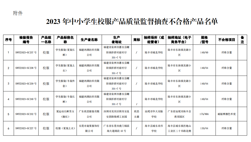 附件:2023年中小學(xué)生校服產(chǎn)品質(zhì)量監(jiān)督抽查不合格產(chǎn)品名單