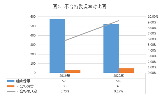 2020年,市市場(chǎng)監(jiān)管局組織開(kāi)展了服裝、鞋、日用塑料制品、農(nóng)業(yè)生產(chǎn)資料、文具及類(lèi)似用品、眼鏡類(lèi)產(chǎn)品、人造板等18種產(chǎn)品的市級(jí)監(jiān)督抽查,抽查產(chǎn)品518款,發(fā)現(xiàn)不合格產(chǎn)品48款,不合格發(fā)現(xiàn)率為9.27%,較2019年不合格發(fā)現(xiàn)率上升了3.54個(gè)百分點(diǎn)。其中,抽查生產(chǎn)領(lǐng)域產(chǎn)品291款,發(fā)現(xiàn)不合格產(chǎn)品36款,不合格發(fā)現(xiàn)率為12.37%;抽查流通領(lǐng)域產(chǎn)品227款,發(fā)現(xiàn)不合格產(chǎn)品12款,不合格發(fā)現(xiàn)率為5.29%。發(fā)現(xiàn)不合格的產(chǎn)品品種主要為塑料制品、定配眼鏡、紙巾類(lèi)、珠寶玉石、貴金屬飾品、西服西褲大衣、油品、燈具及照明裝置8種產(chǎn)品。