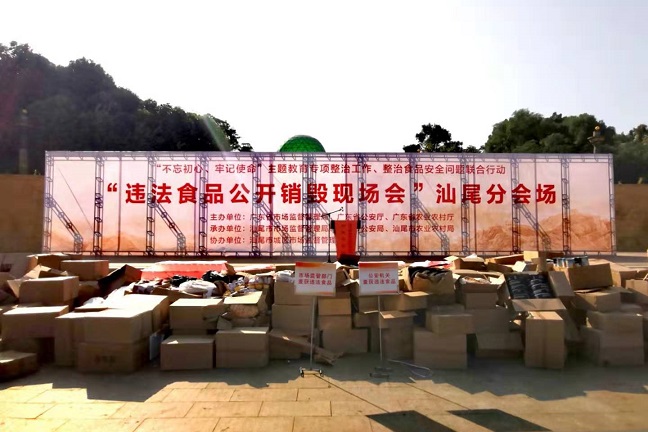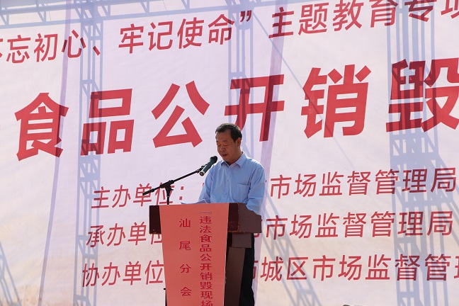 為深入推進(jìn)整治食品安全問(wèn)題聯(lián)合行動(dòng),認(rèn)真落實(shí)“不忘初心、牢記使命”主題教育專(zhuān)項(xiàng)整治漠視侵害群眾利益問(wèn)題的工作部署,11月20日,市市場(chǎng)監(jiān)管局按照省的統(tǒng)一部署,聯(lián)合市公安、農(nóng)業(yè)農(nóng)村、教育等部門(mén),在市區(qū)慈云山公園開(kāi)展違法食品公開(kāi)銷(xiāo)毀現(xiàn)場(chǎng)會(huì)。省市場(chǎng)監(jiān)管局粵東稽查辦公室楊磊副調(diào)研員、市市場(chǎng)監(jiān)管局黨組成員、副局長(zhǎng)陳文戟及市公安局、農(nóng)業(yè)農(nóng)村局、教育局、市人大代表、政協(xié)委員和市、區(qū)兩級(jí)市場(chǎng)監(jiān)管部門(mén)執(zhí)法人員共100多人參加了活動(dòng)。