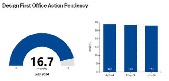 據(jù)悉,美國(guó)外觀設(shè)計(jì)專利通常比獲得實(shí)用新型專利更快,但目前美國(guó)的外觀設(shè)計(jì)專利申請(qǐng)的審查周期仍然較長(zhǎng)。根據(jù)美國(guó)專利商標(biāo)局(USPTO)2024年7月發(fā)布的數(shù)據(jù),在過(guò)去一年中,從外觀設(shè)計(jì)申請(qǐng)?zhí)峤蝗掌诘降谝淮螌彶橐庖?jiàn)寄出日期的平均時(shí)間為16.7個(gè)月(下圖1)。在2024年7月,這一平均值已攀升至17.1個(gè)月。尤其是在消費(fèi)品領(lǐng)域,考慮到產(chǎn)品更新?lián)Q代較快,如此長(zhǎng)的審查周期可能不適合外觀設(shè)計(jì)專利申請(qǐng)人。