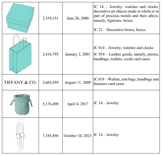 蒂芙尼近年在美國(guó)發(fā)起的侵權(quán)訴訟案由均為商標(biāo),其中還包括部分商業(yè)外觀,部分如下: