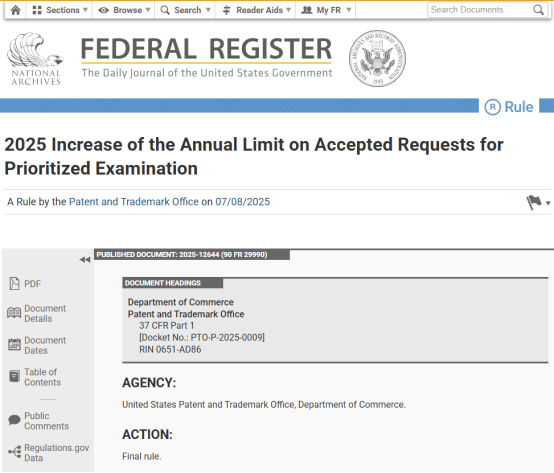 自2025年7月8日起,美國專利商標(biāo)局(USPTO)擴(kuò)大了優(yōu)先審查的可用性,將一個(gè)財(cái)政年度的請(qǐng)求數(shù)量上限從15,000件提高到20,000件。20,000個(gè)上限適用于所有已獲批準(zhǔn)的優(yōu)先審查請(qǐng)求的總和,包括新申請(qǐng)的Track One請(qǐng)求和已提交繼續(xù)審查請(qǐng)求(RCE)的待審申請(qǐng)中的優(yōu)先審查請(qǐng)求。此更改已在USPTO立即實(shí)施的最終規(guī)則中采用,無需事先通知或發(fā)表評(píng)論,以繼續(xù)滿足希望使用該計(jì)劃的申請(qǐng)人數(shù)量。優(yōu)先審查是許多公司(包括生命科學(xué)公司)用來加快關(guān)鍵專利授予的工具。