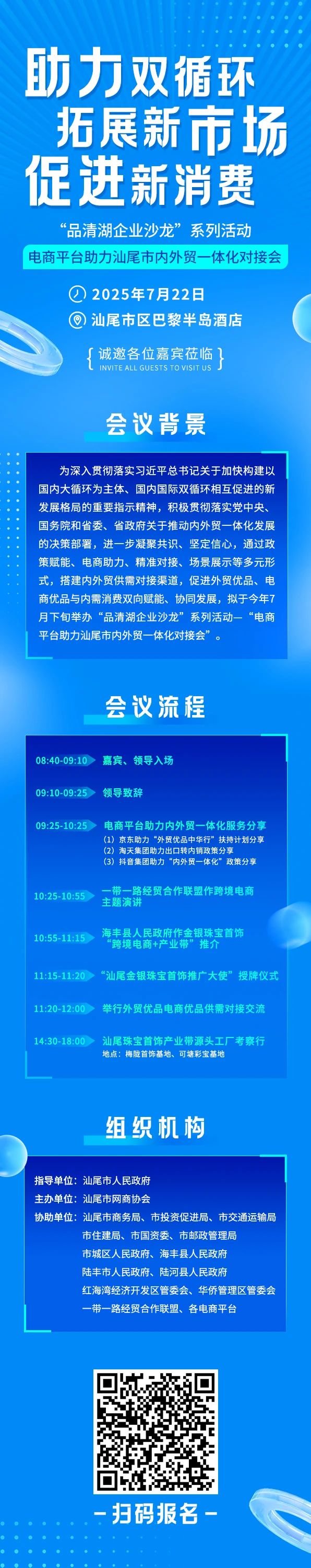 為深入貫徹落實習近平總書記關(guān)于加快構(gòu)建以國內(nèi)大循環(huán)為主體、國內(nèi)國際雙循環(huán)相互促進的新發(fā)展格局的重要指示精神,積極貫徹落實黨中央、國務(wù)院和省委、省政府關(guān)于推動內(nèi)外貿(mào)一體化發(fā)展的決策部署,進一步凝聚共識、堅定信心,通過政策賦能、電商助力、精準對接、場景展示等多元形式,搭建內(nèi)外貿(mào)供需對接渠道,促進外貿(mào)優(yōu)品、電商優(yōu)品與內(nèi)需消費雙向賦能、協(xié)同發(fā)展,擬于今年7月22日舉辦“品清湖企業(yè)沙龍”系列活動—“電商平臺助力汕尾市內(nèi)外貿(mào)一體化對接會”。
